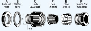 A.C.E.F部分以UL认可之尼龙PA66制成(防火等级UL94V-2),B及D部分采用EPDM耐候橡胶制成。